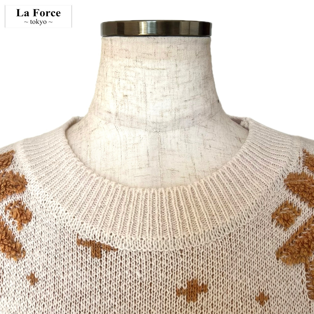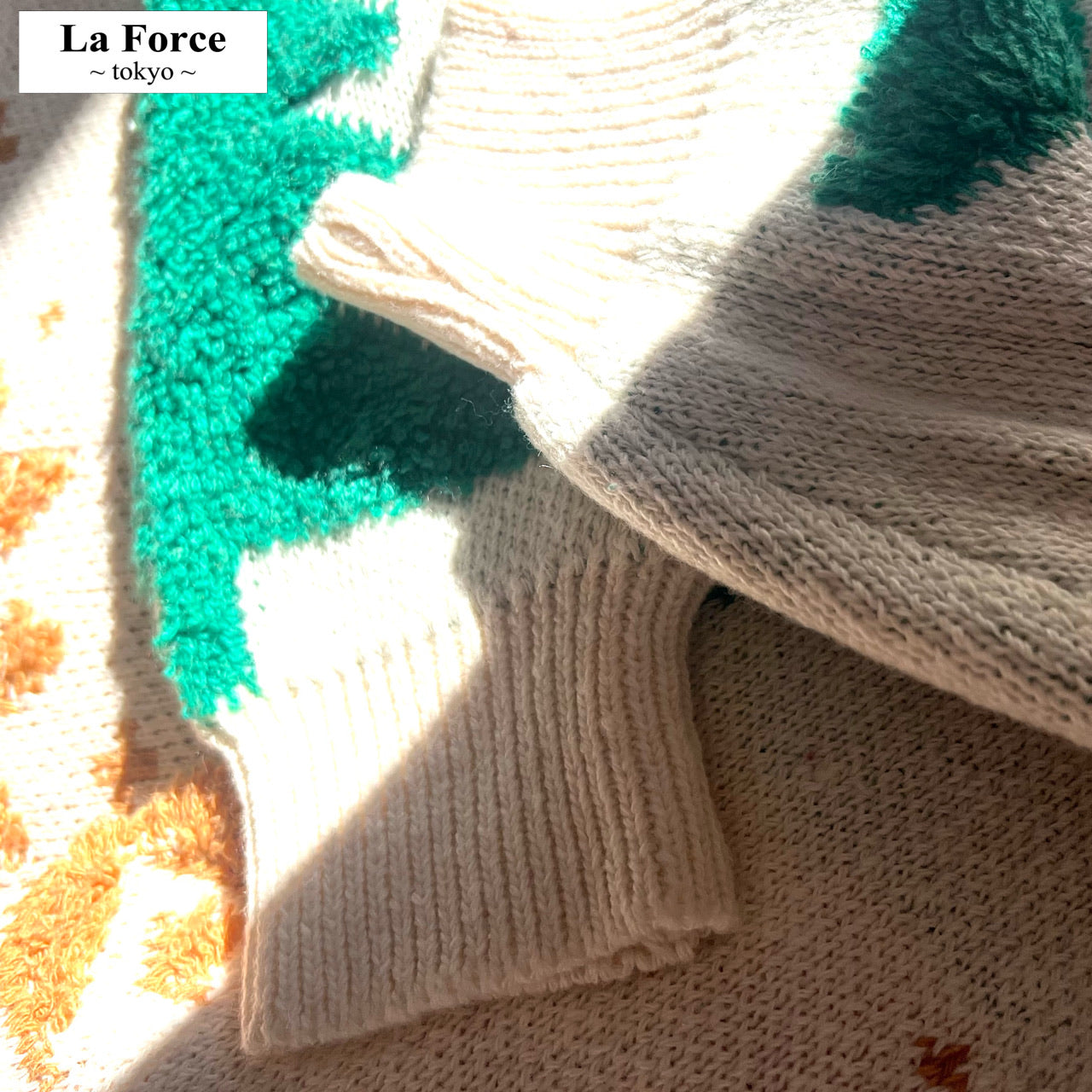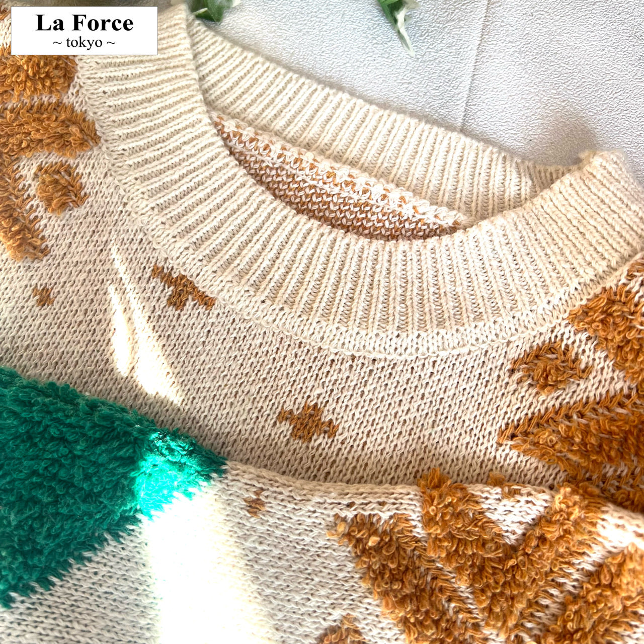 防寒に優れた目の詰まった編地に、さり気ないドロップショルダー、ゆるっとしたサイズ感覚などノンストレスな着心地に加え、心躍るポップなデザイン、顔周りを華やかに見せるカラーリングなど、遊び心と華やぎを合わせてもった一枚です♪