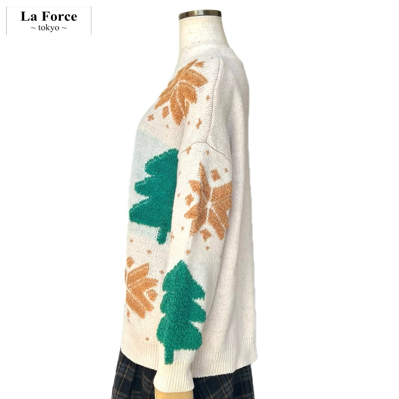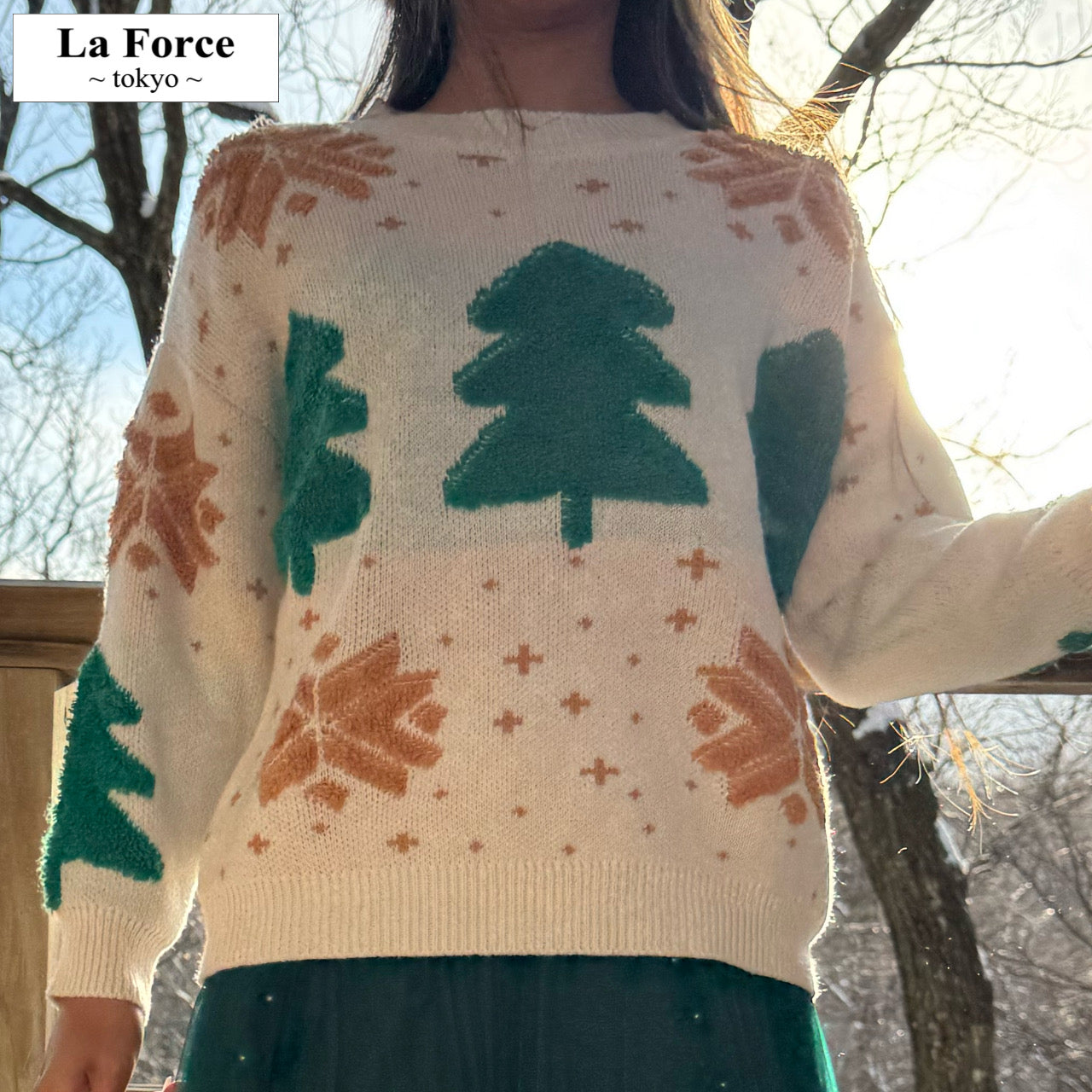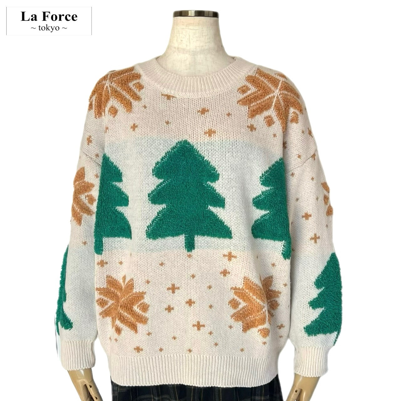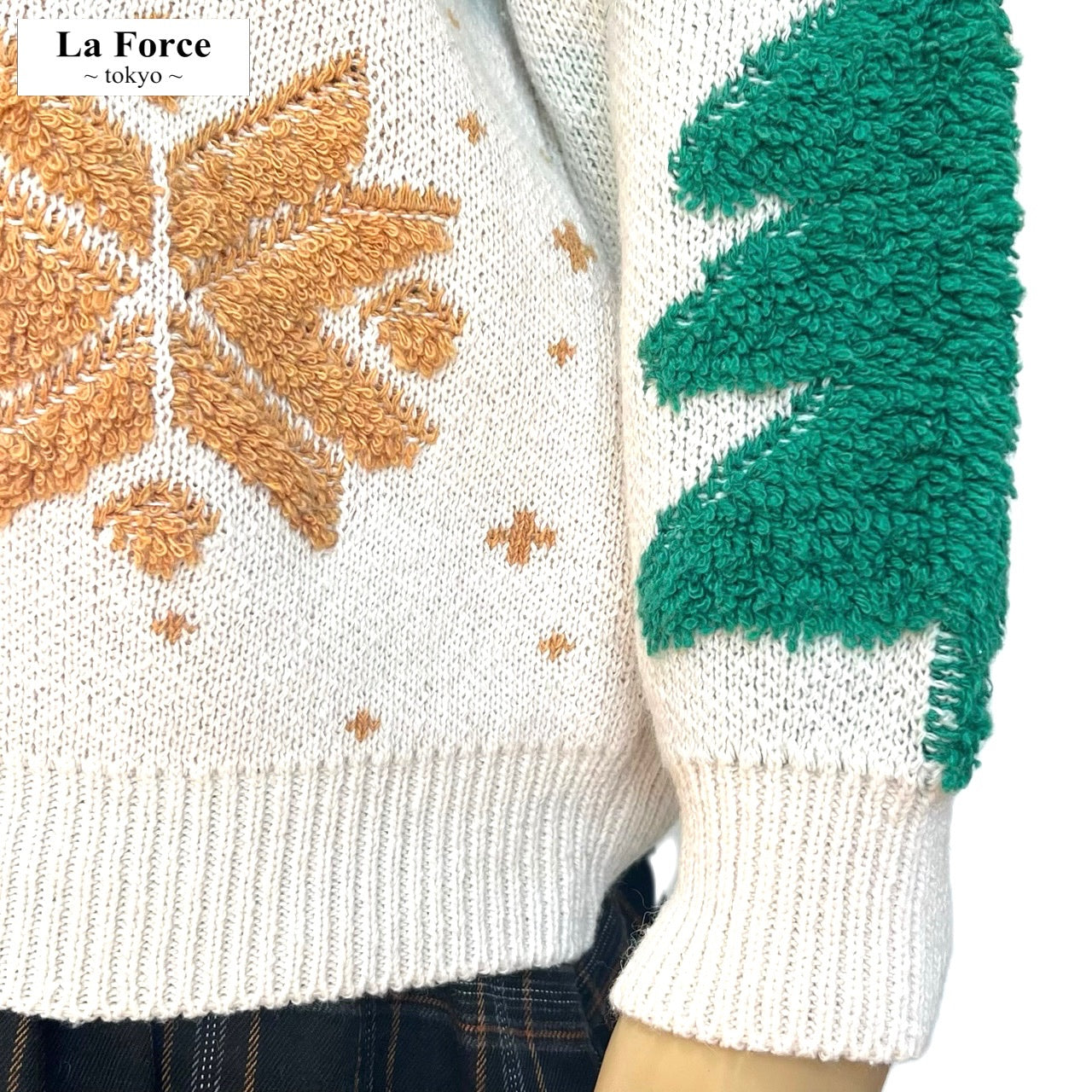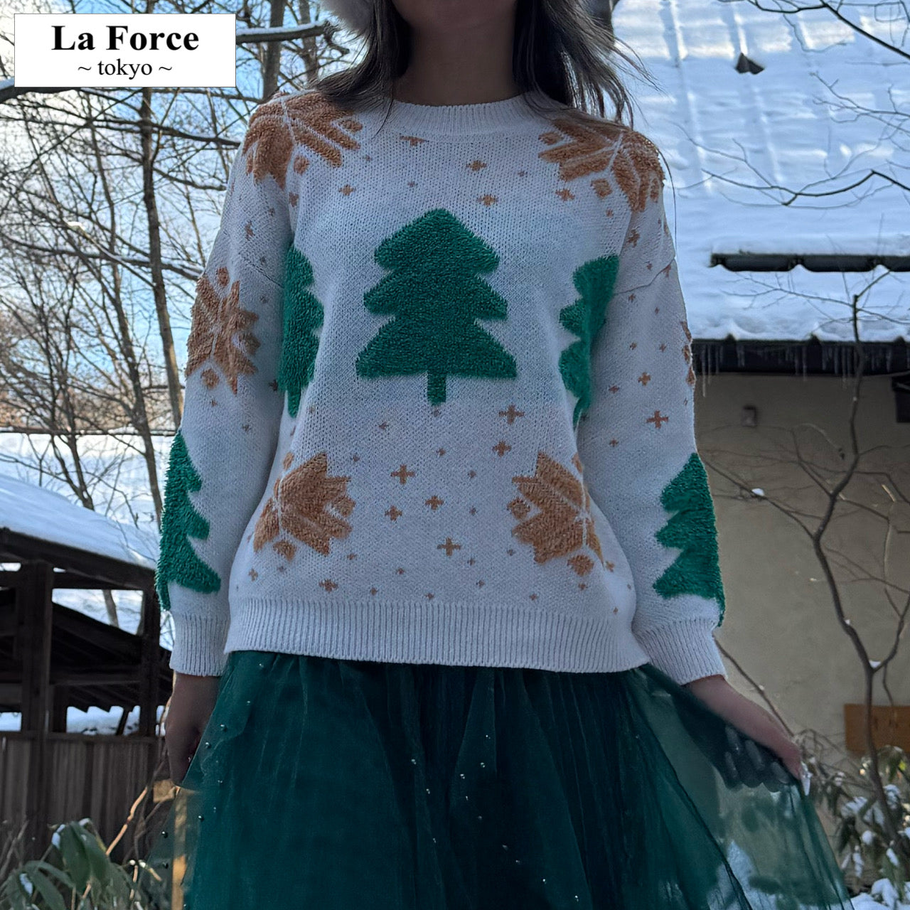 もこもこのクリスマスツリーと雪の結晶をモチーフにして、着るだけで気分が上がるレトロテイストなプルオーバー♪