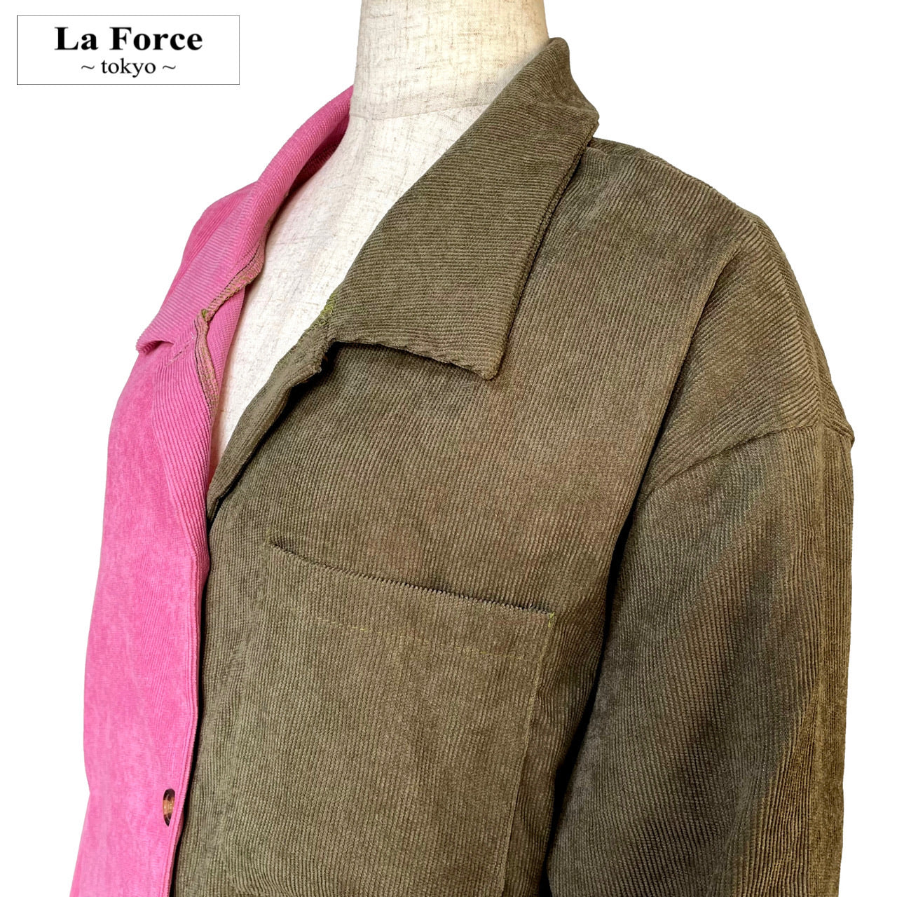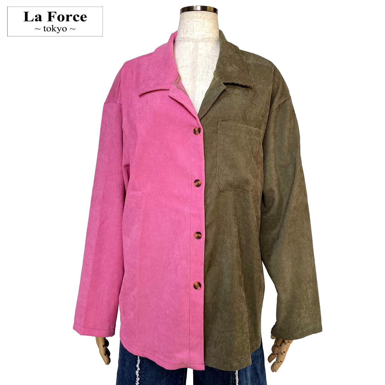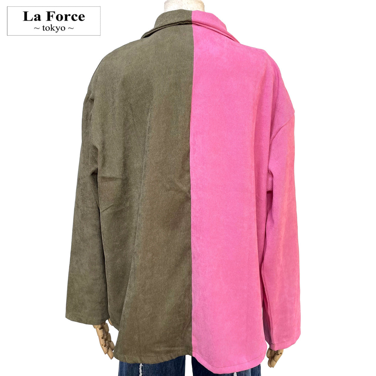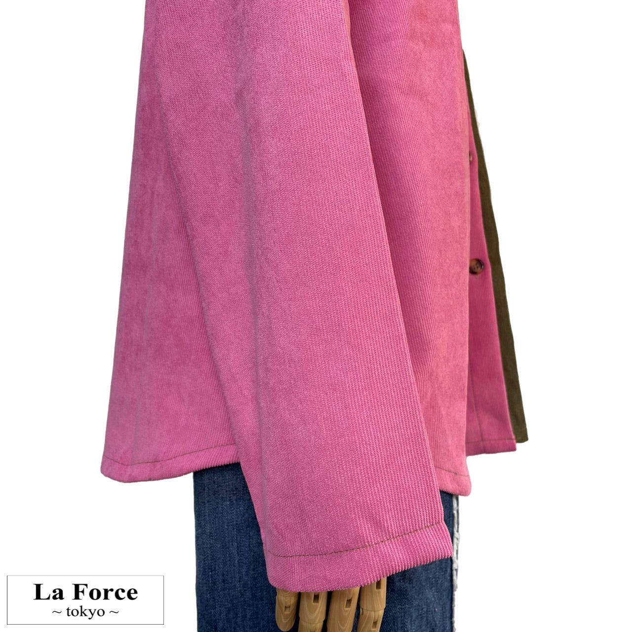 ピンクとカーキのツートンカラーデザインが鮮やかなスタイリッシュな薄手のコーデュロイシャツ!