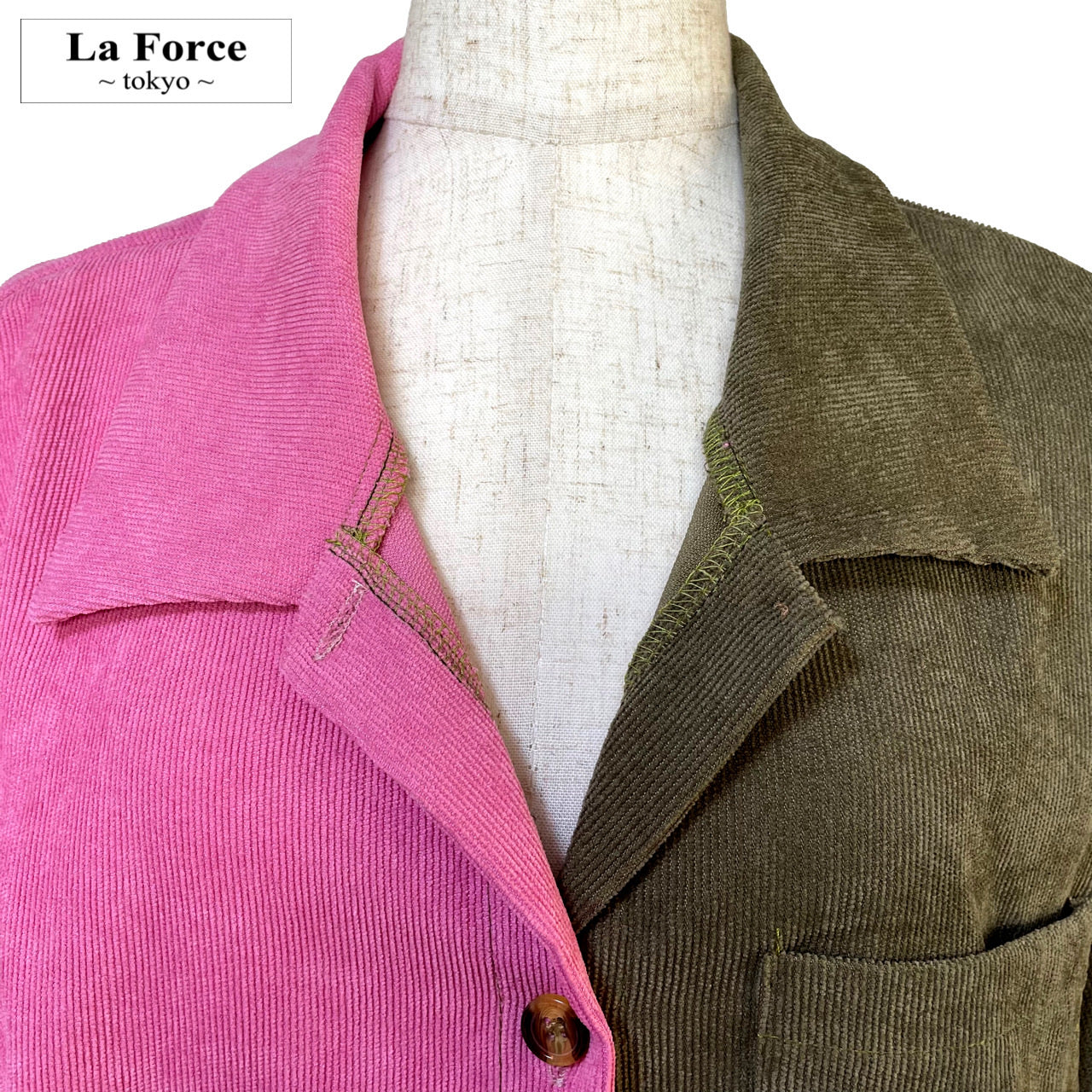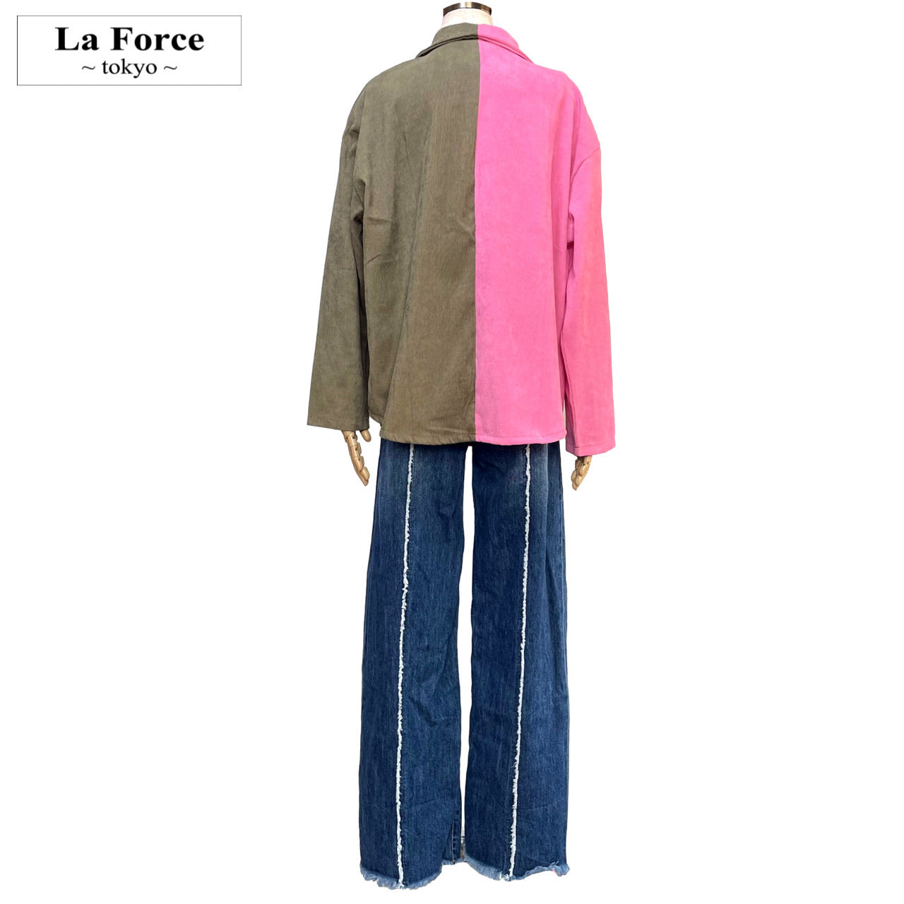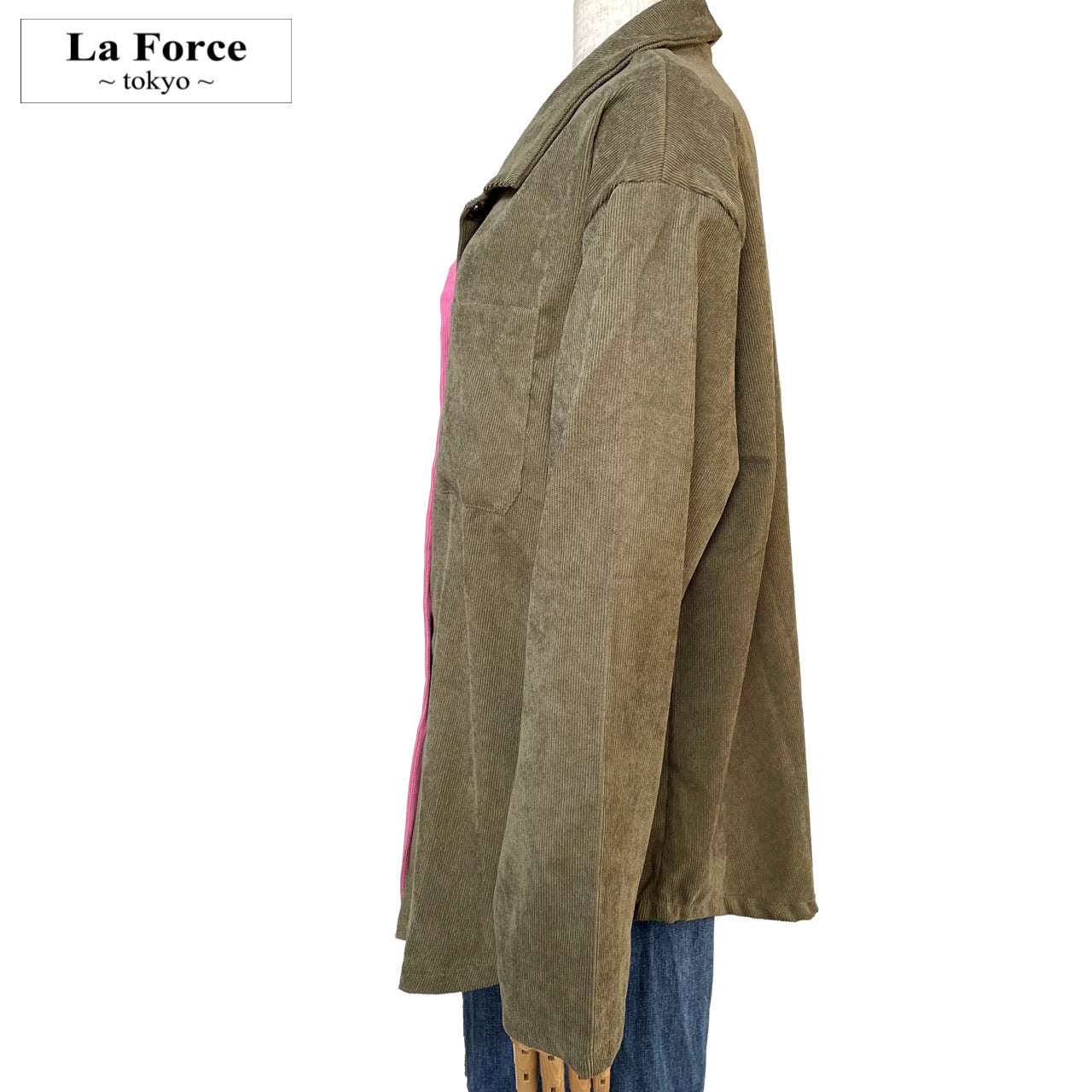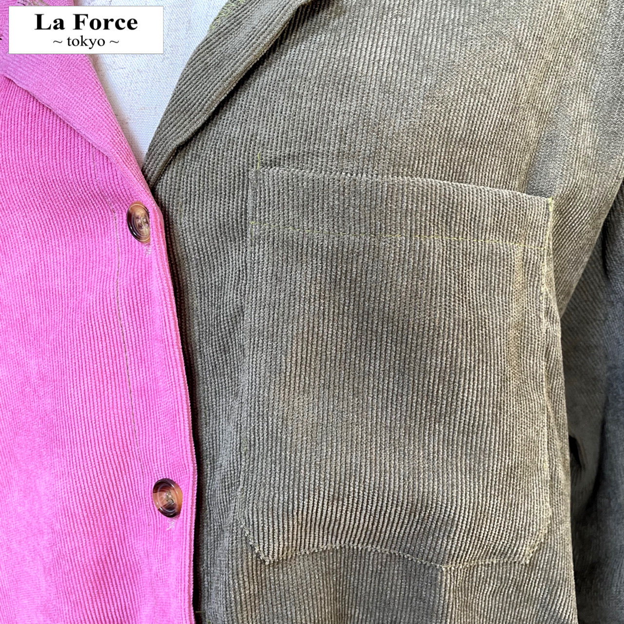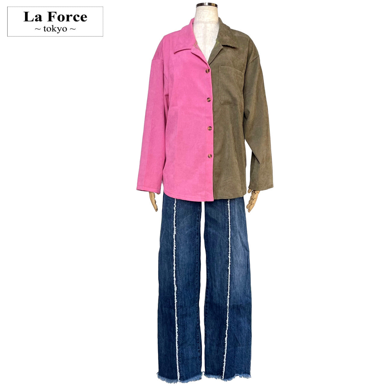 ピンクとカーキのツートンカラーデザインが鮮やかなスタイリッシュな薄手のコーデュロイシャツ!